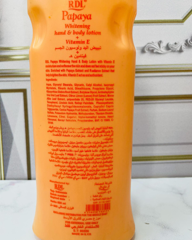 لوسیون سفید کننده قوی دست و بدن پاپایا RDL(اورجینال) لوسیون سفید کننده دست و بدن RDL با عصاره پاپایا حس جوانی پوست شما را حفظ می کند. ترکیبی از عامل سفید کننده و ویتامین E پوست شما را به طور طبیعی سفید می کند. فرمولاسیون سبک برای پوست با رایحه ای لطیف و ماندگار. غنی شده با مرطوب کننده ها برای حفظ تعادل رطوبت پوست و نرم نگه داشتن آن. ویژگیها • آبرسان • روشن کننده • مرطوب کننده • سفیدکننده • حاوی عصاره پاپایا هندی • حجم 600 میل
