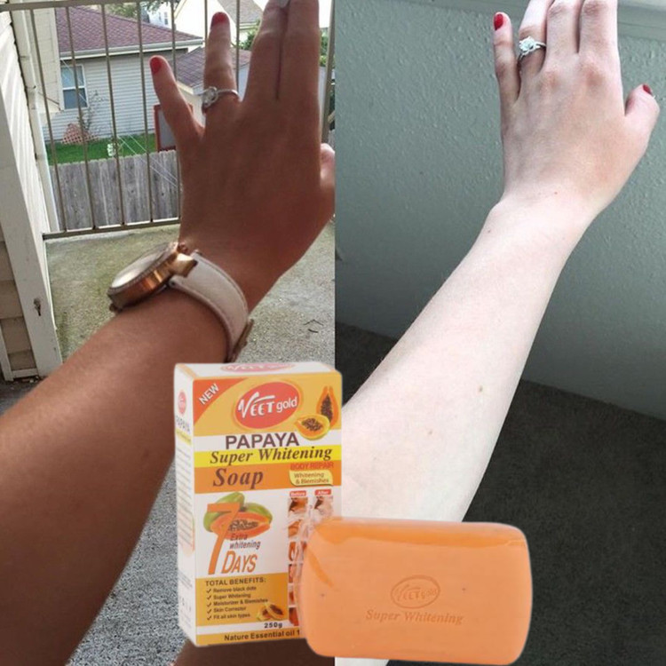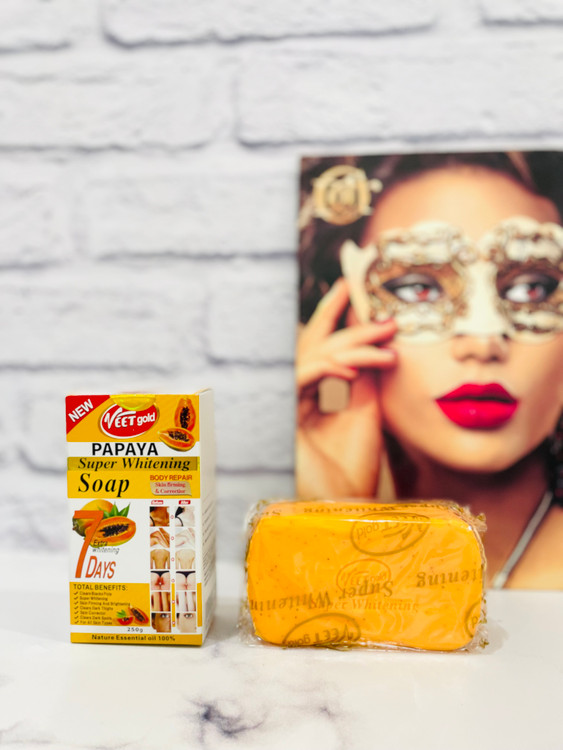 صابون پاپایا ویتگلد (VEETgold Papaya Whitening Soap) یک صابون سفیدکننده و لایهبردار طبیعی است که با ترکیبات گیاهی و ویتامینها ساخته شده. این محصول علاوه بر پاکسازی عمیق پوست، به روشنتر شدن، نرمی و شفافیت پوست کمک میکند.